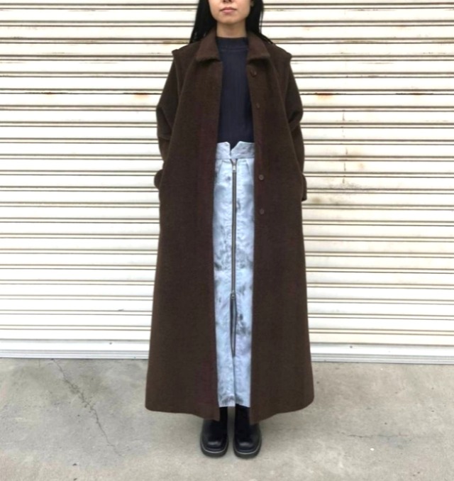 ヘリンボーン柄に仕立てたスーリーアルパカの毛足が特徴的なオーバーサイズのヴィンテージマシキコートをリサイズし、肩のタックやボタン等をリデザインしたアイテム。 アルパカは毛の色が多く生地を作る際に染色せずに原毛そのままの色で使える為、 エコでサスティナブルな素材となっています。 その中でスーリーアルパカは光沢感と滑らかさが特徴ですがデリケートな性質で繁殖が難しい為、希少な種になっています。 ロング丈でも軽さがありしっかりとした温かさのあるアイテムです。 Made in Japan Size…F(約9号) 総丈 後ろ中心 131cm 裄丈 80.5cm 身幅 52cm Material… 表地 アルパカ(スーリーアルパカ) 65% 毛 35% 裏地 キュプラ100% Color…ダークブラウン Washing Method… ・水洗いは出来ません。クリーニングをご利用下さい。 ・タンブル乾燥はお避け下さい。 ・アイロンは直接あてると毛足が倒れてしまうので、表側からアイロンを浮かしてスチームをあてるか、裏側から軽くアイロンをあてて下さい。 ※こちらは一点物の作品になっております。 他サイトでも取り扱いの為、ご購入の際に時間差で売り切れになってしまう場合もございます。 ラッピングは省き、残布を使って製作したエコバッグ又は巾着ポーチにお入れしてお送り致します。 商品により使用する残布の柄、色、大きさは変わります。 お手に取ってご覧頂く事が出来ませんので、ご不明な点がございましたらご質問下さいませ。