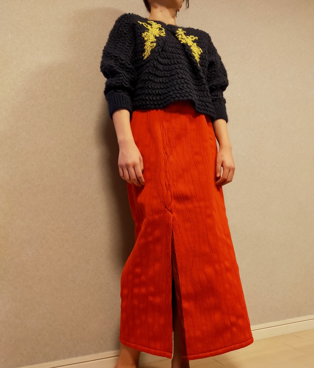 ウレタン素材を挟み込んだ柔らかい弾力のあるボンディング素材を使用したロングスカート。