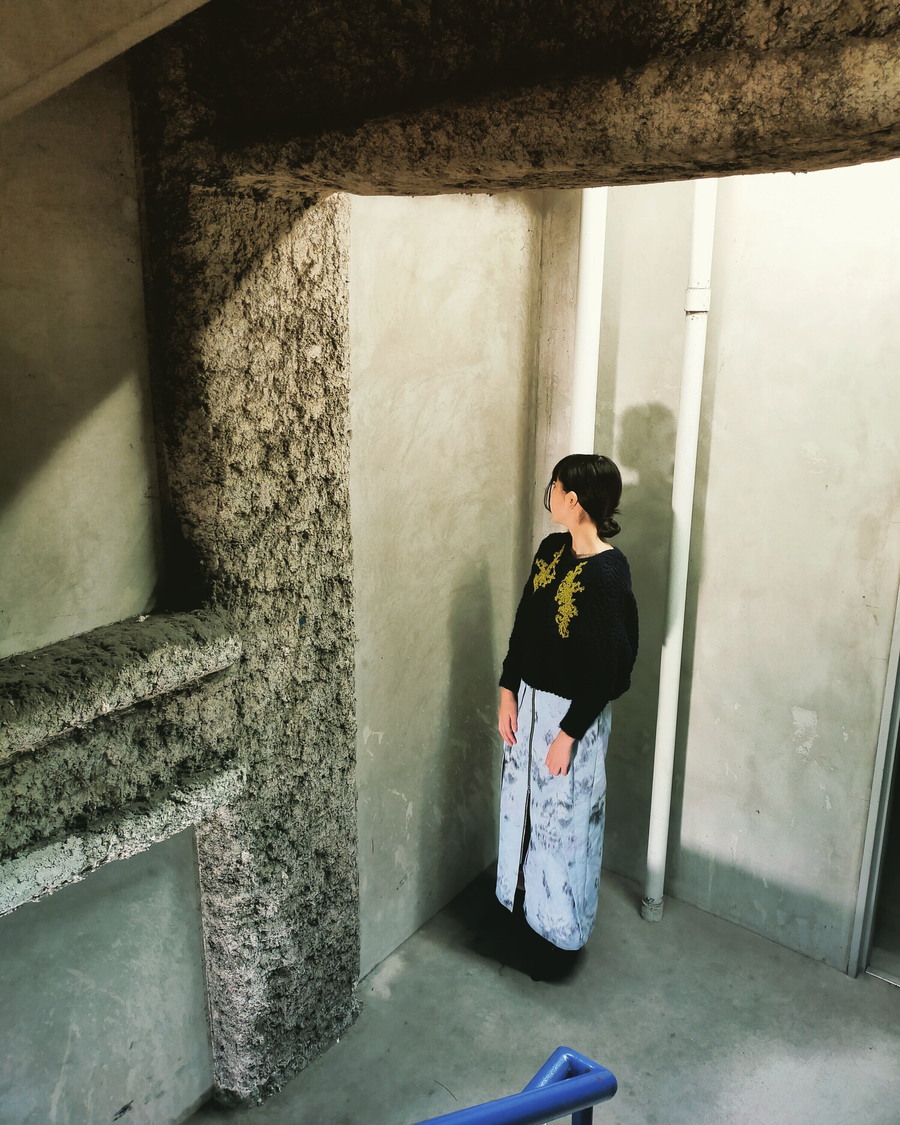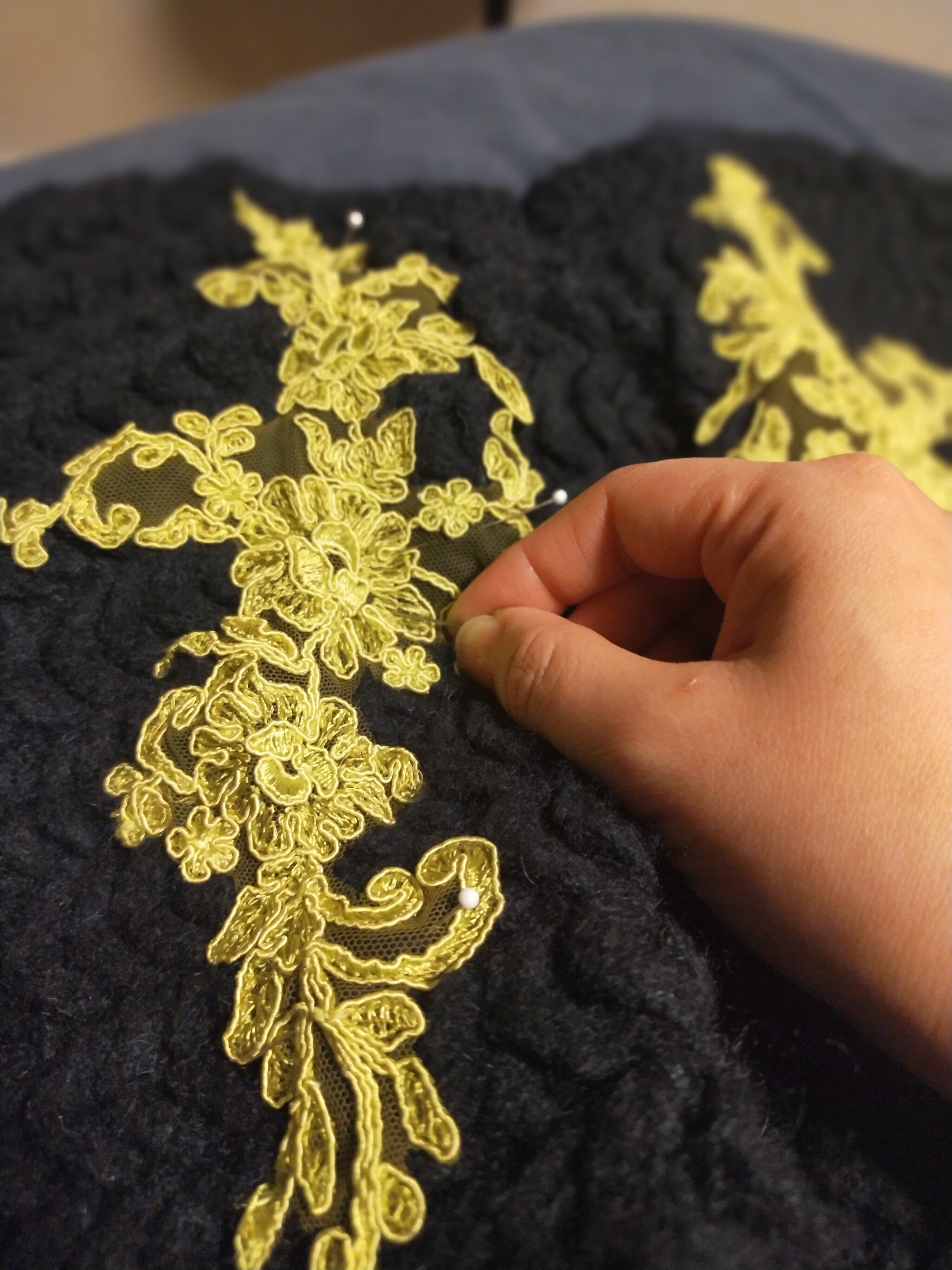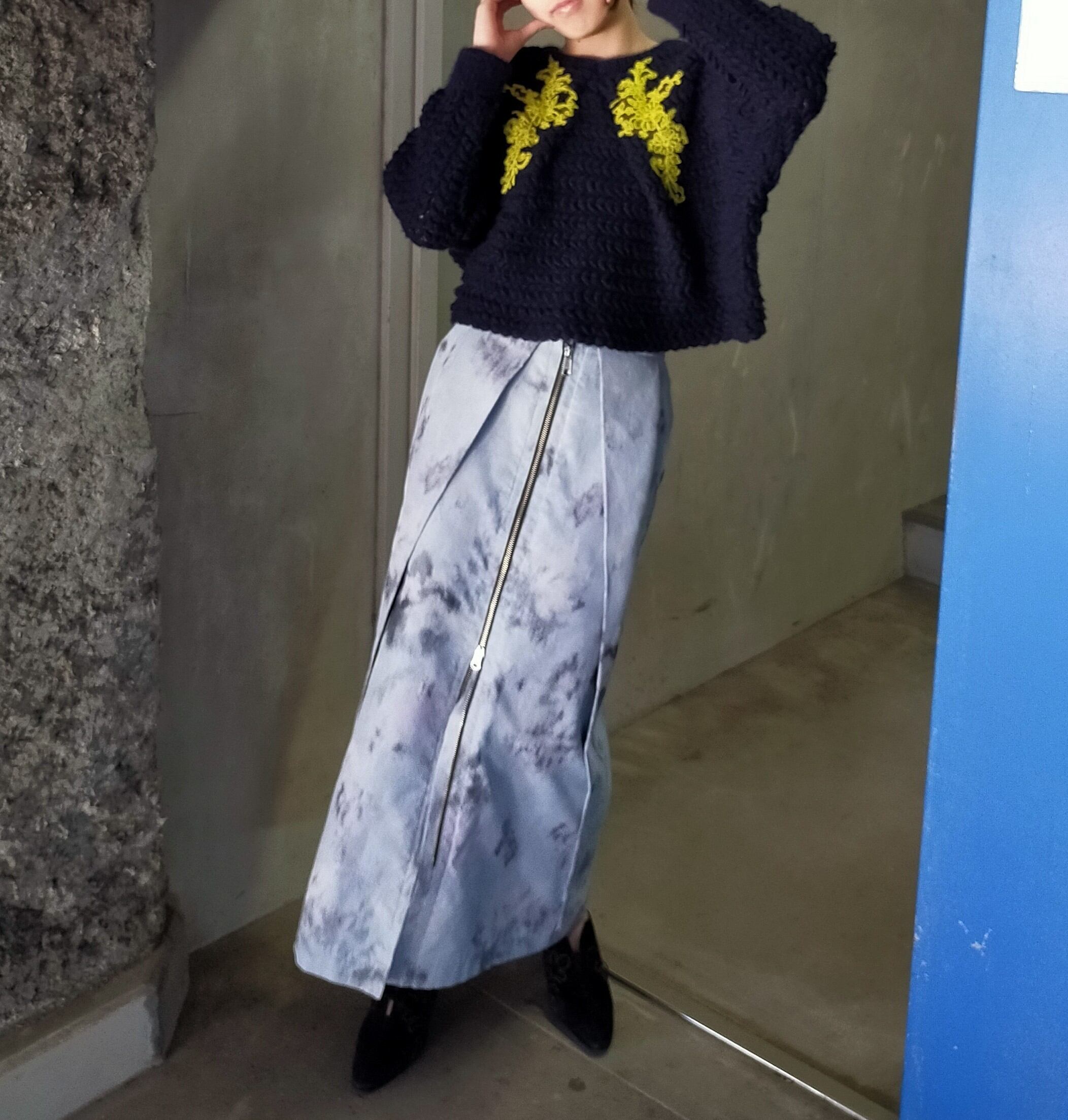 フロントタックと鮮やかなブライトイエローカラーのレースモチーフを手作業で施したリデザインニット。