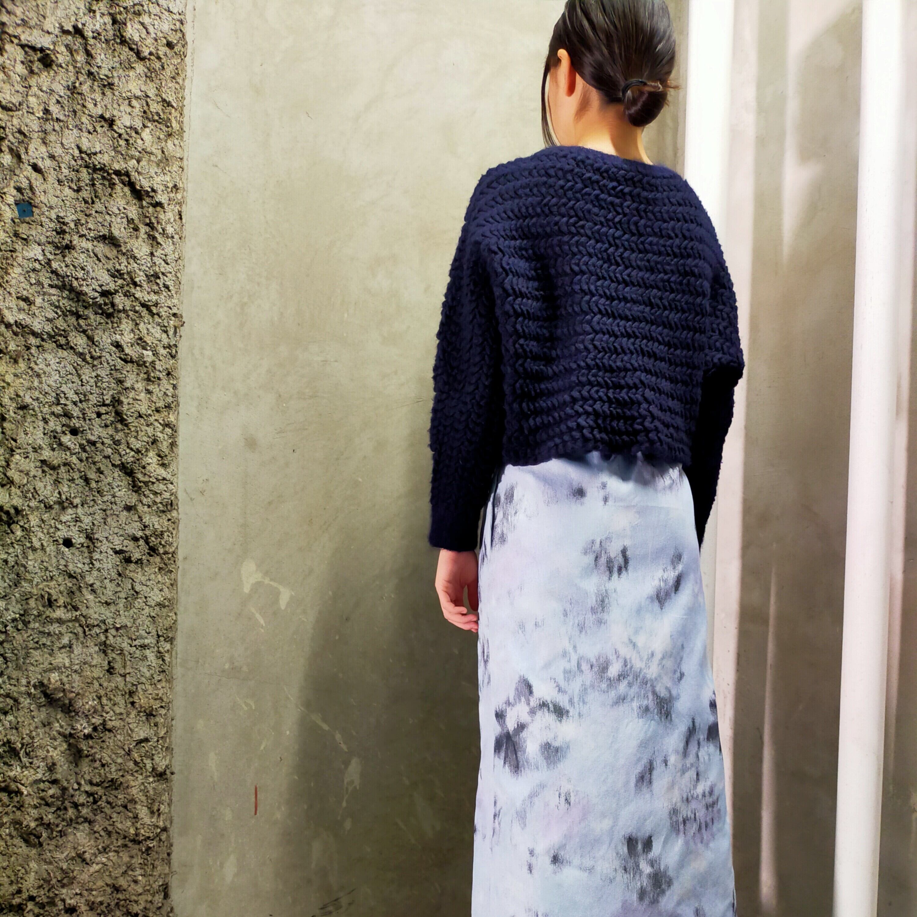 深いネイビーカラーの凹凸感のある編地とドルマンスリーブが特徴的なローゲージのニットに、