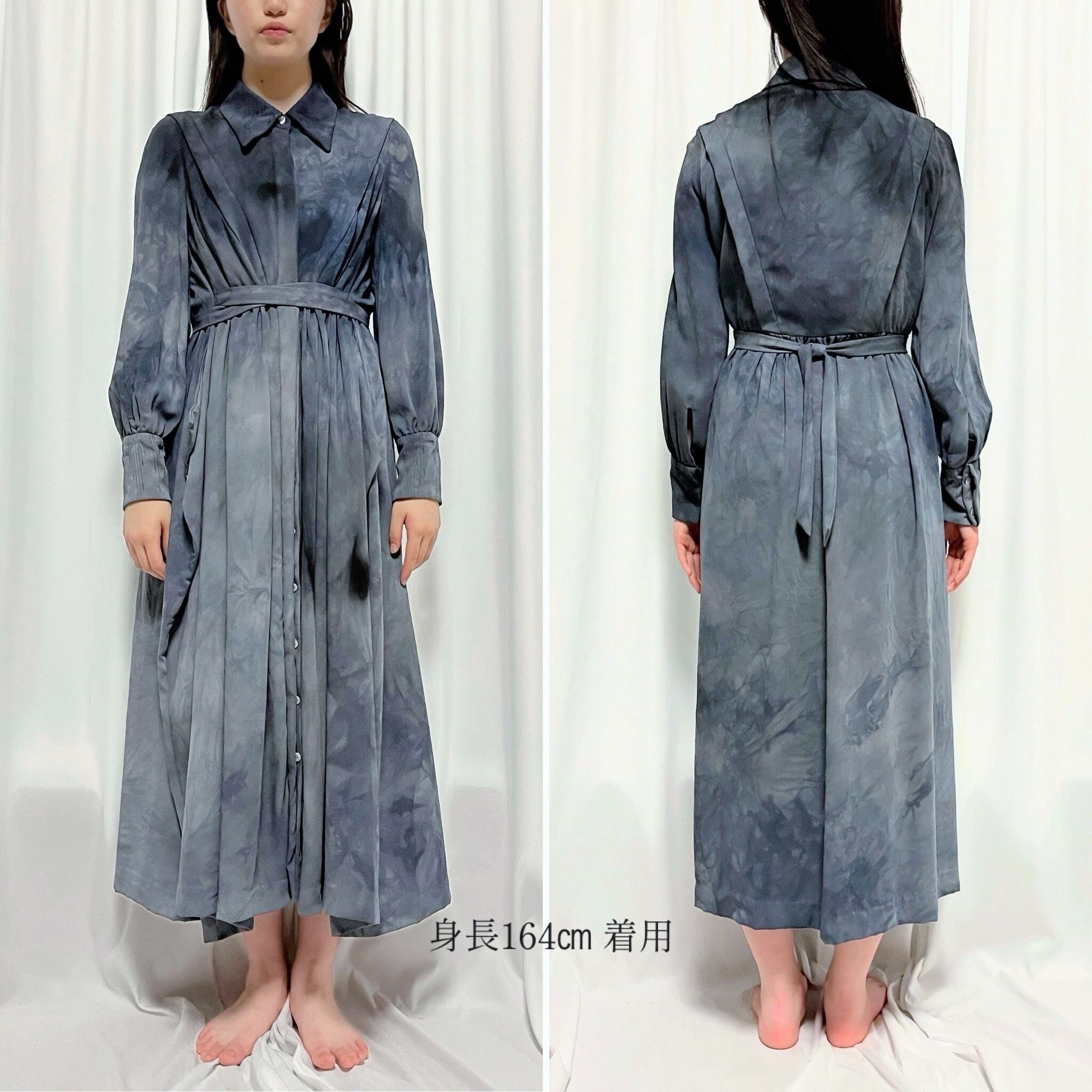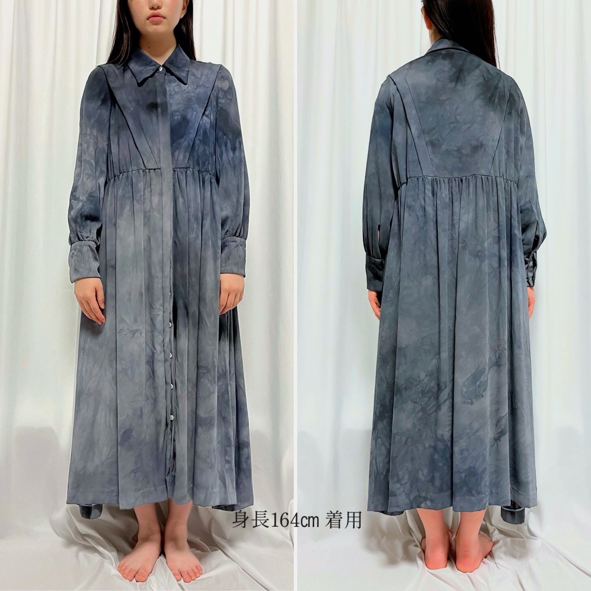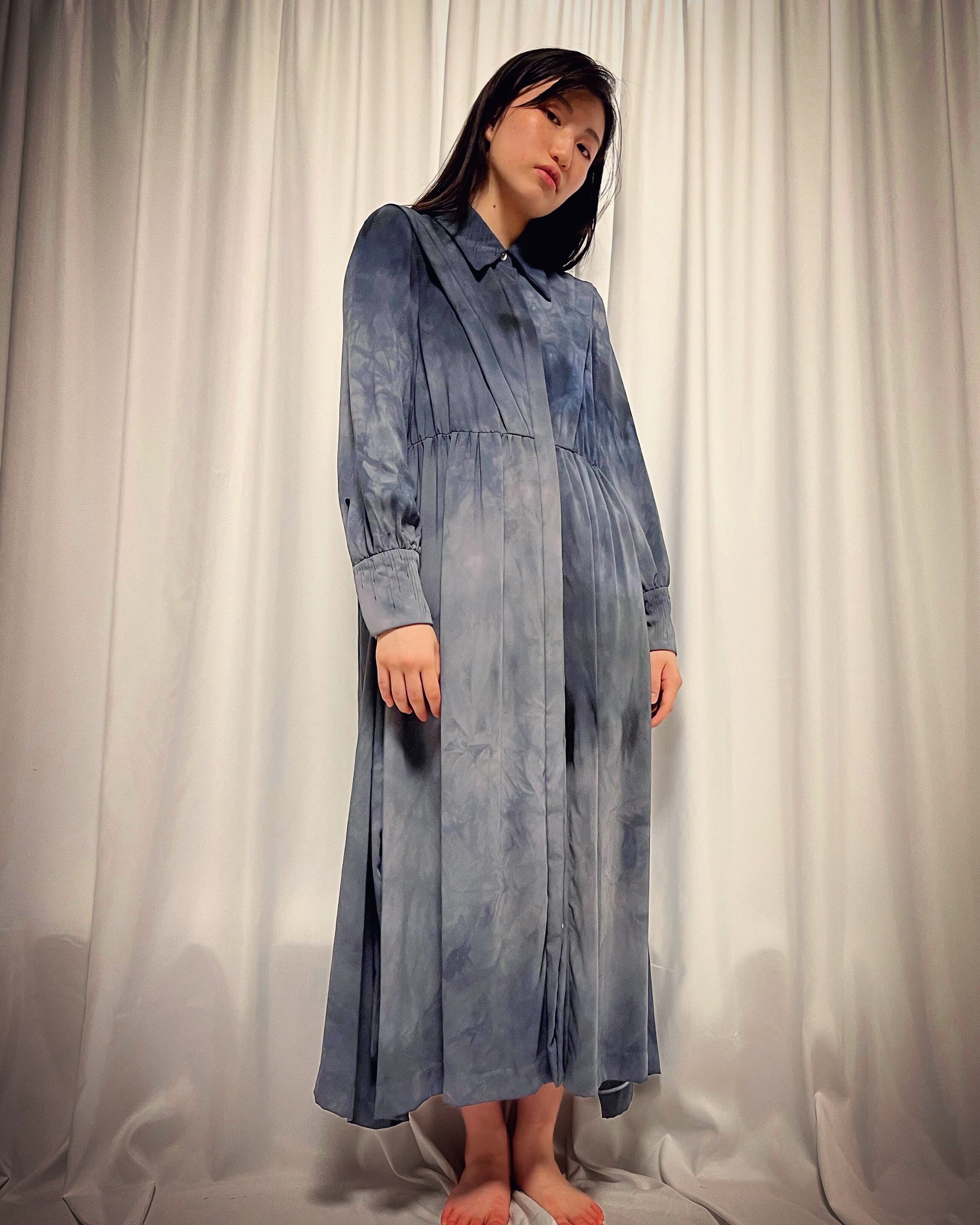 衿と袖口カフス部分にランダムな雫模様のステッチをあしらったマキシワンピースに、グレー〜ネイビーのむら感を残した製品染めを施しました。
