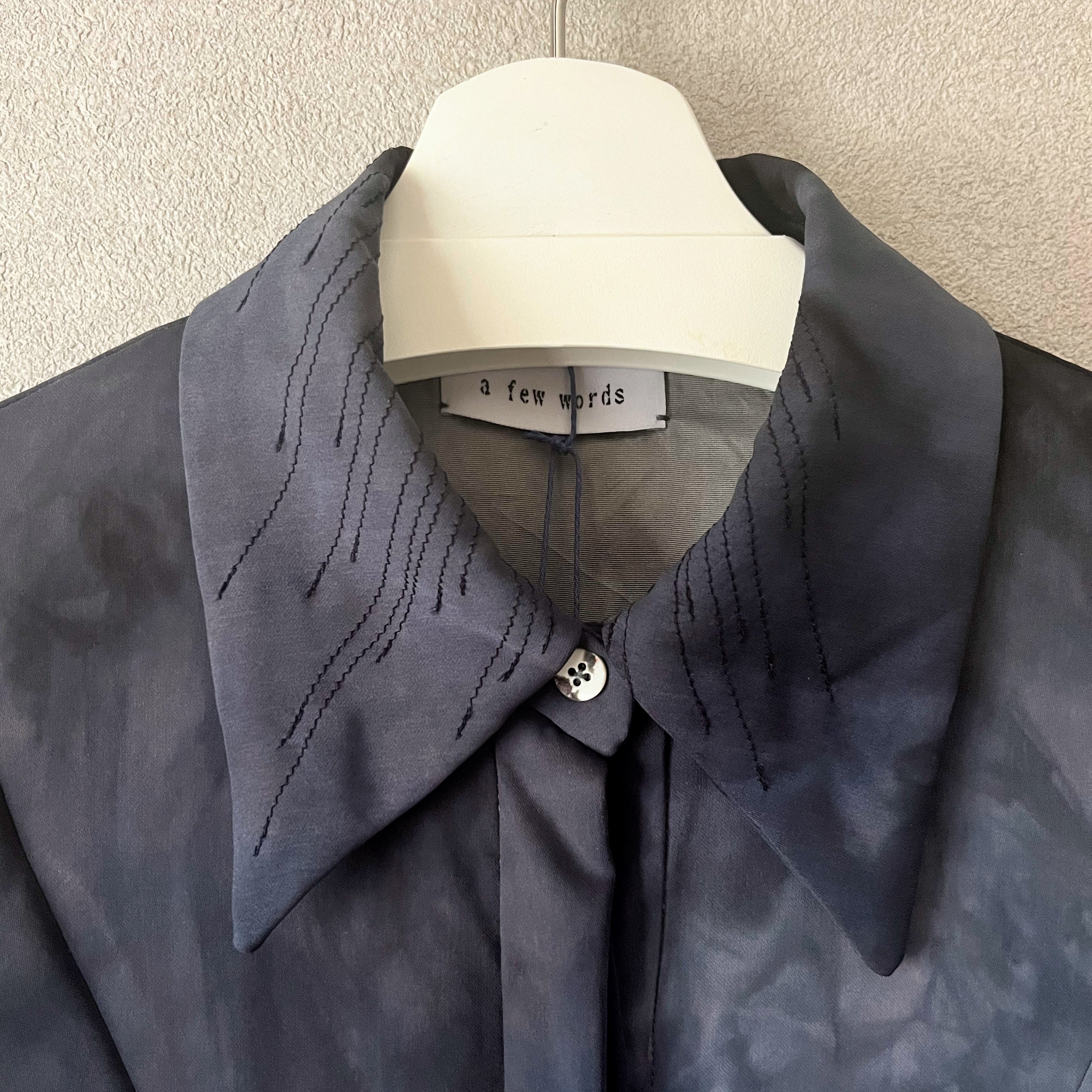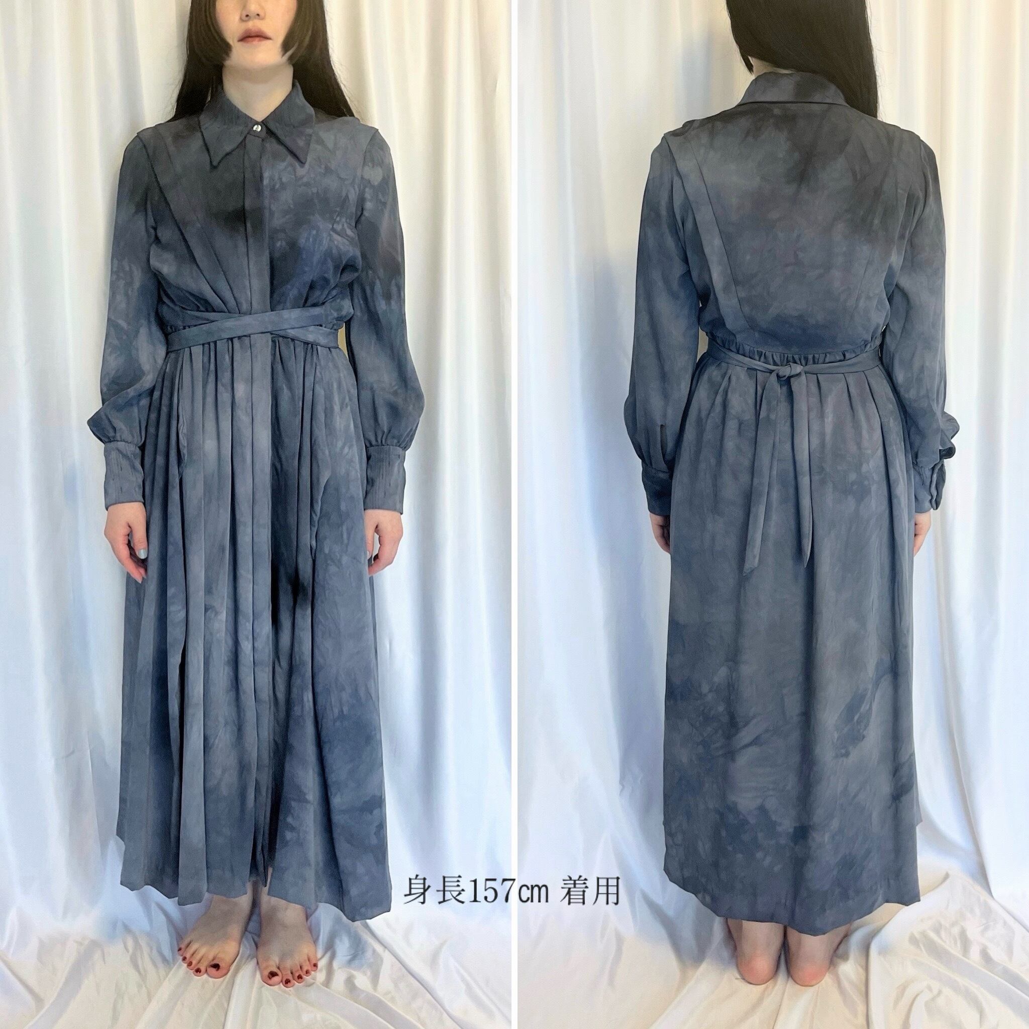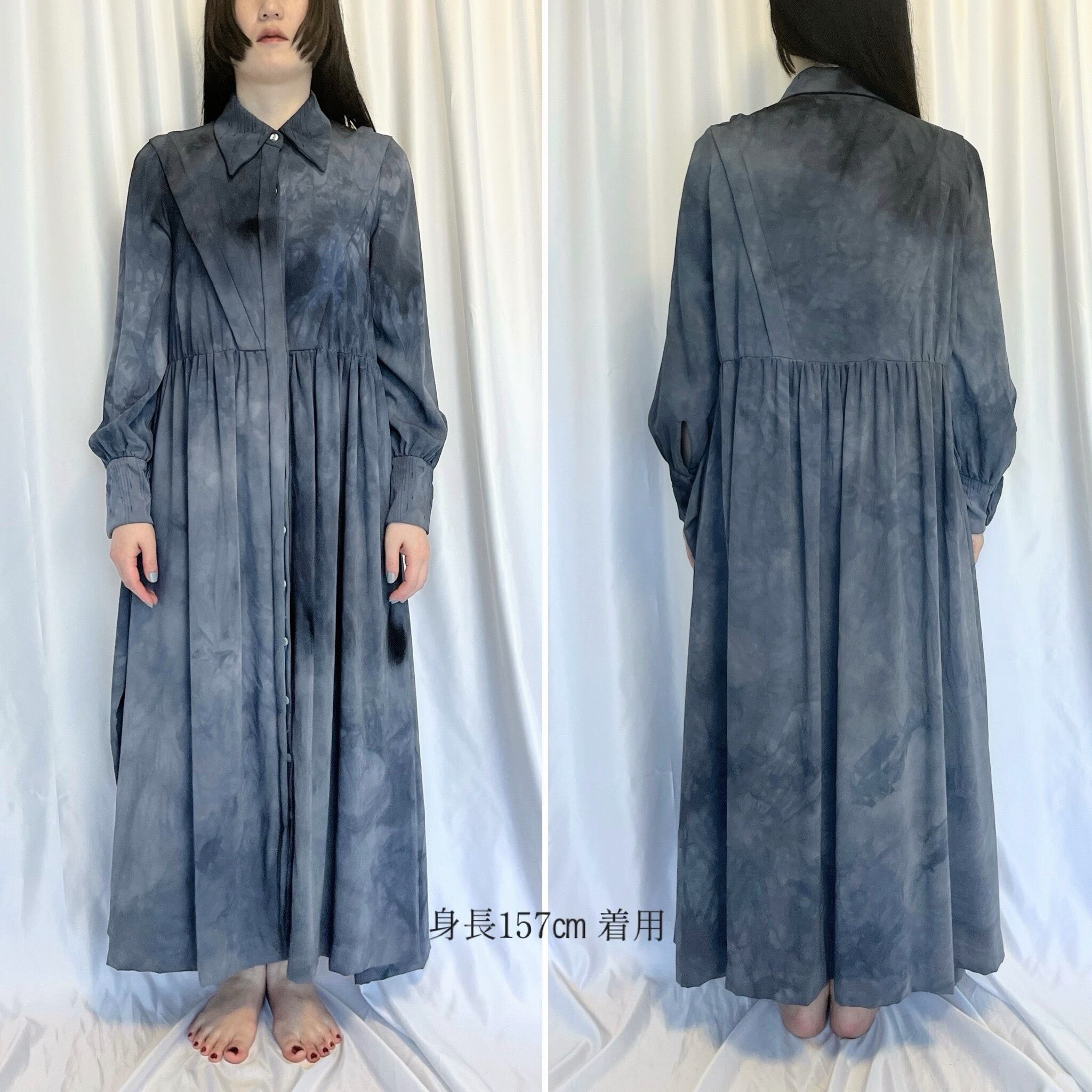 衿と袖口カフス部分にランダムな雫模様のステッチをあしらったマキシワンピースに、グレー〜ネイビーのむら感を残した製品染めを施しました。