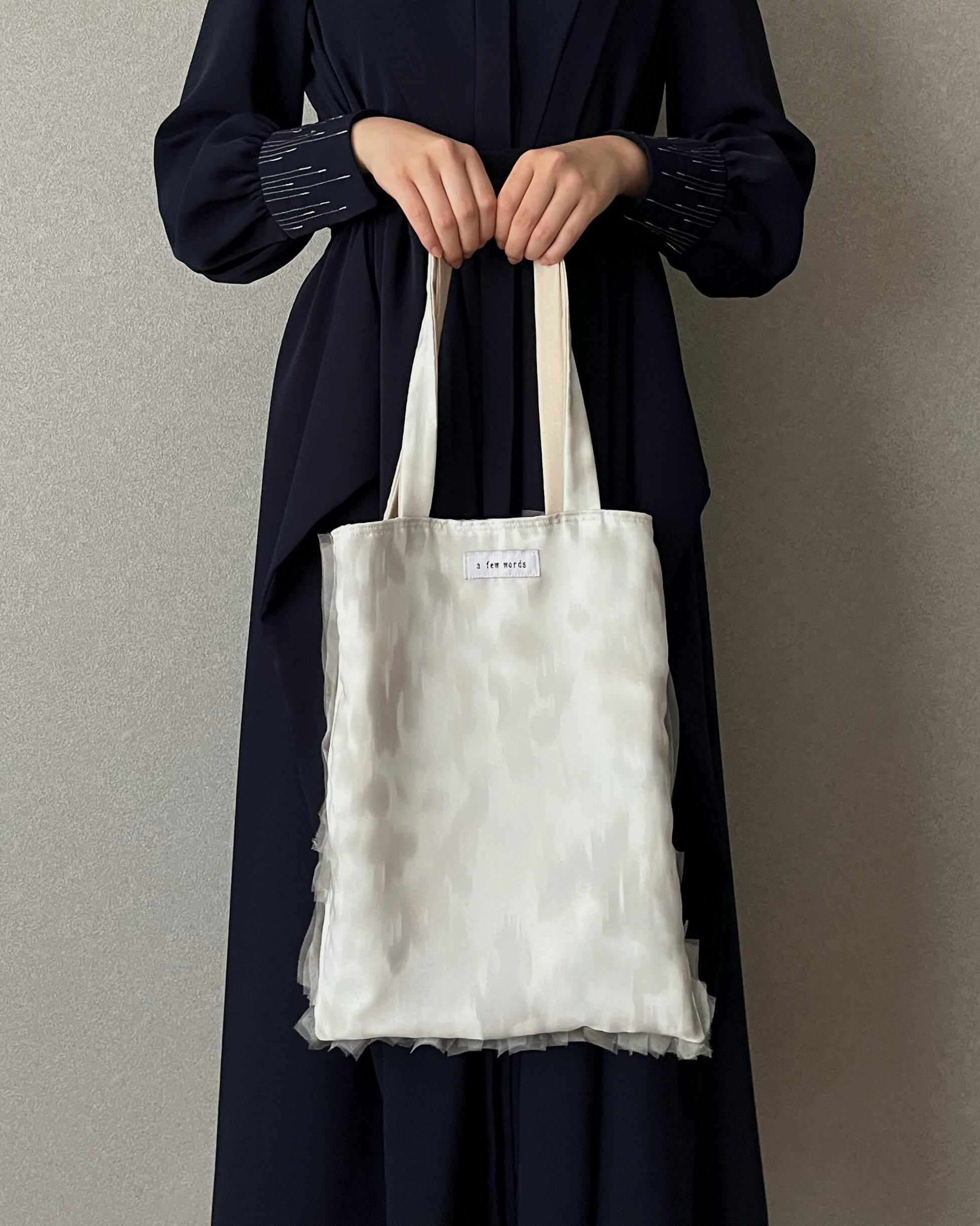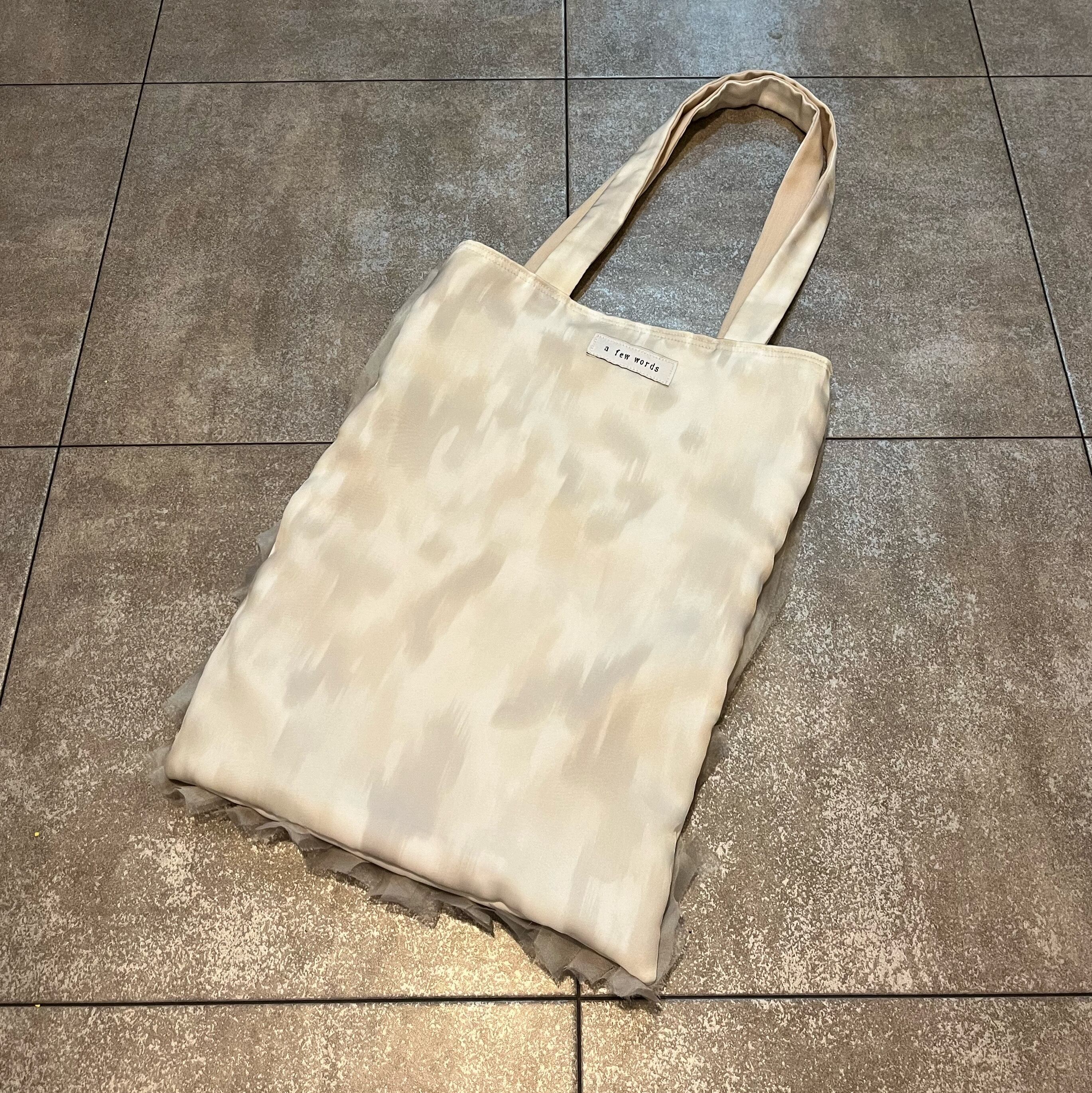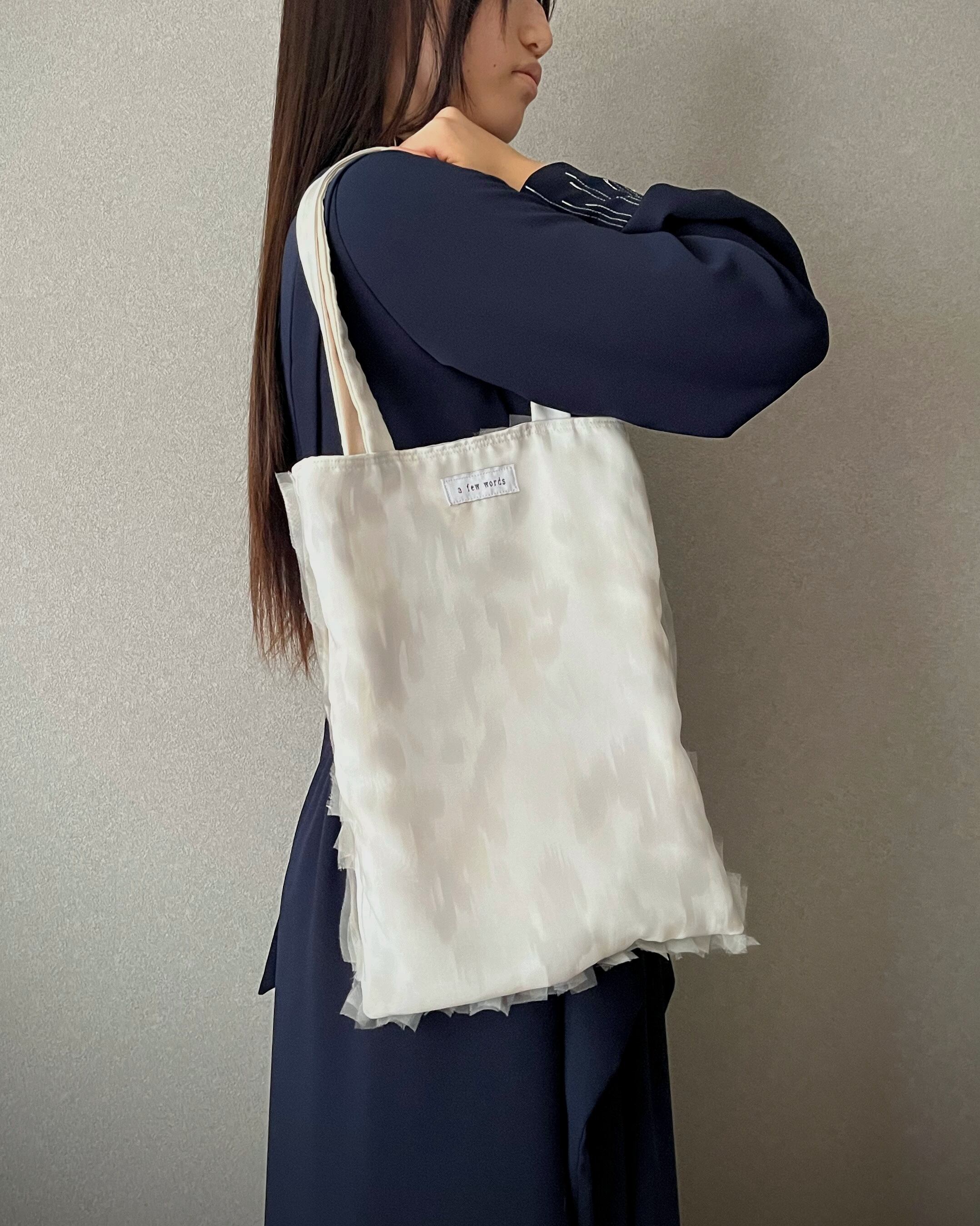 透け感のある、まだらグラデーションプリントのオーガンジーを重ねる事で奥行き感と雰囲気のあるトートバッグに仕上げました。