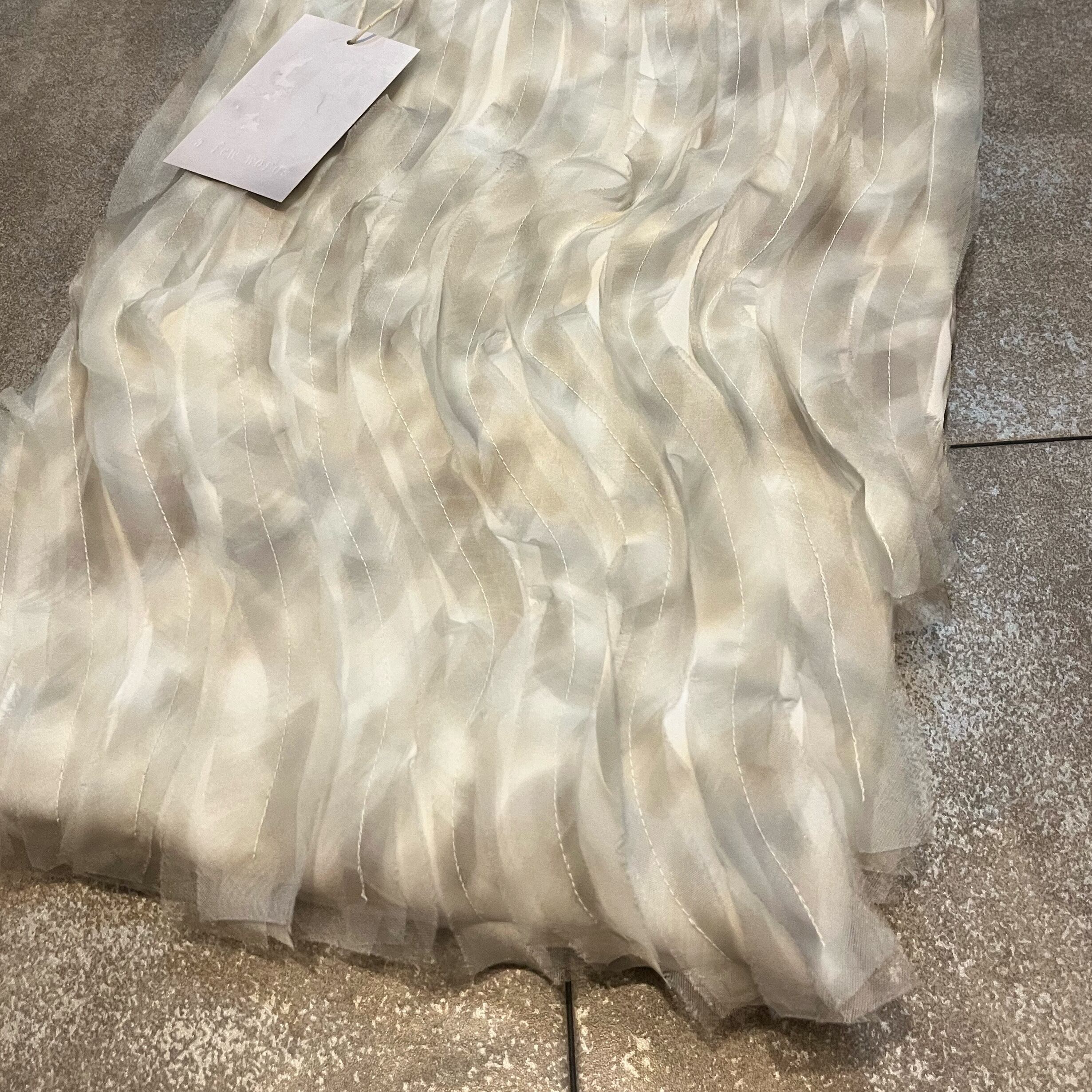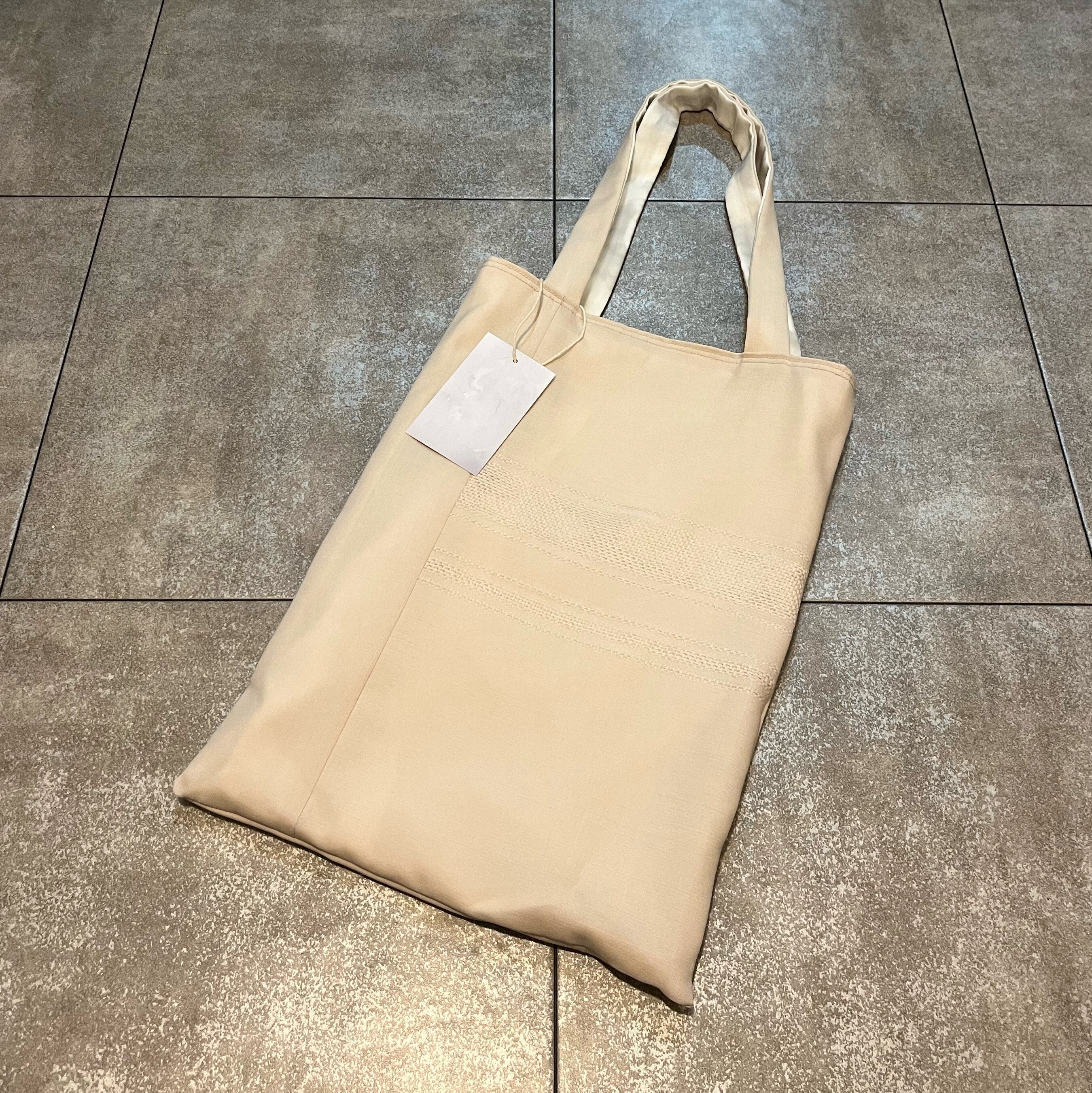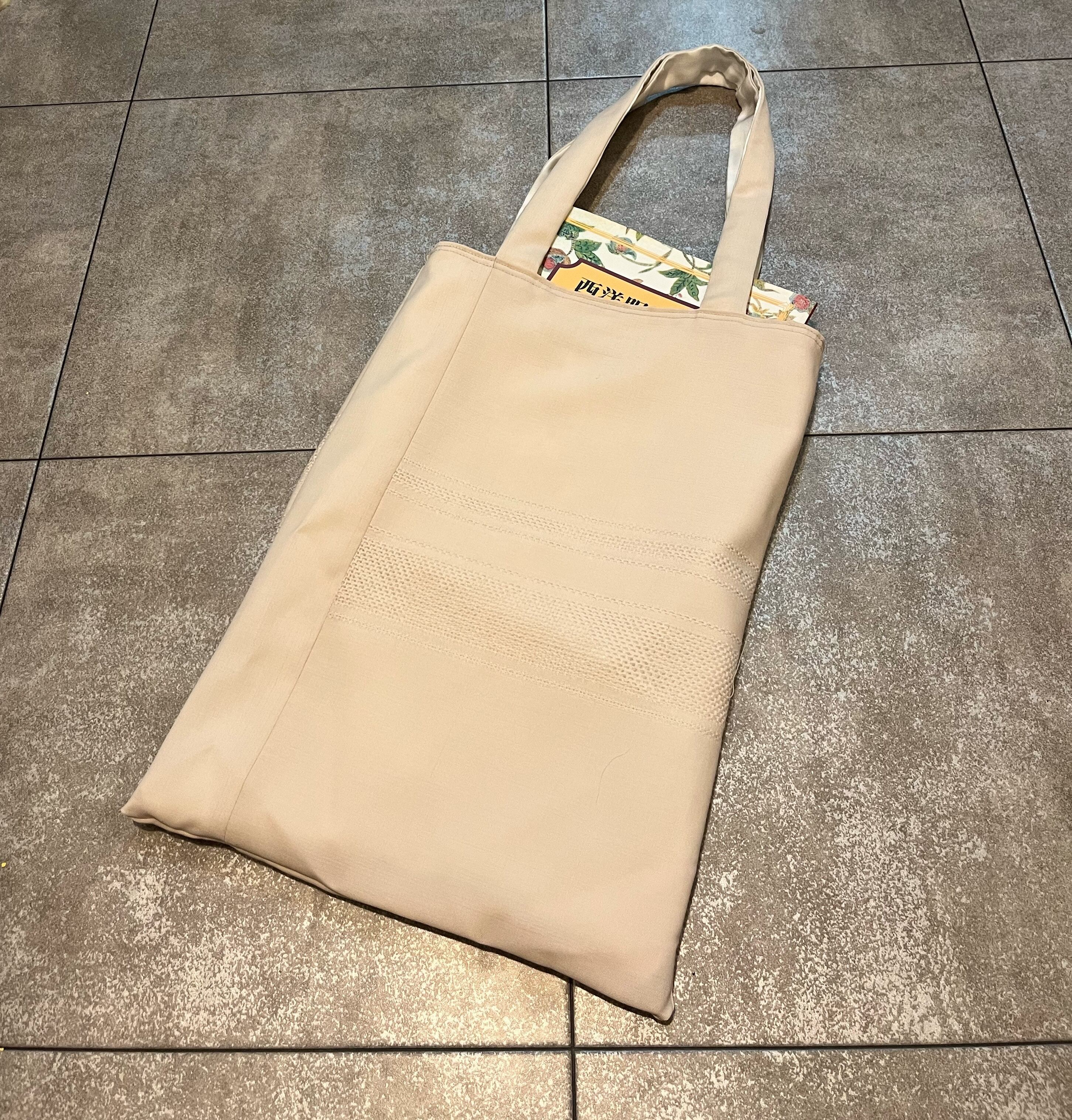 透け感のある、まだらグラデーションプリントのオーガンジーを重ねる事で奥行き感と雰囲気のあるトートバッグに仕上げました。